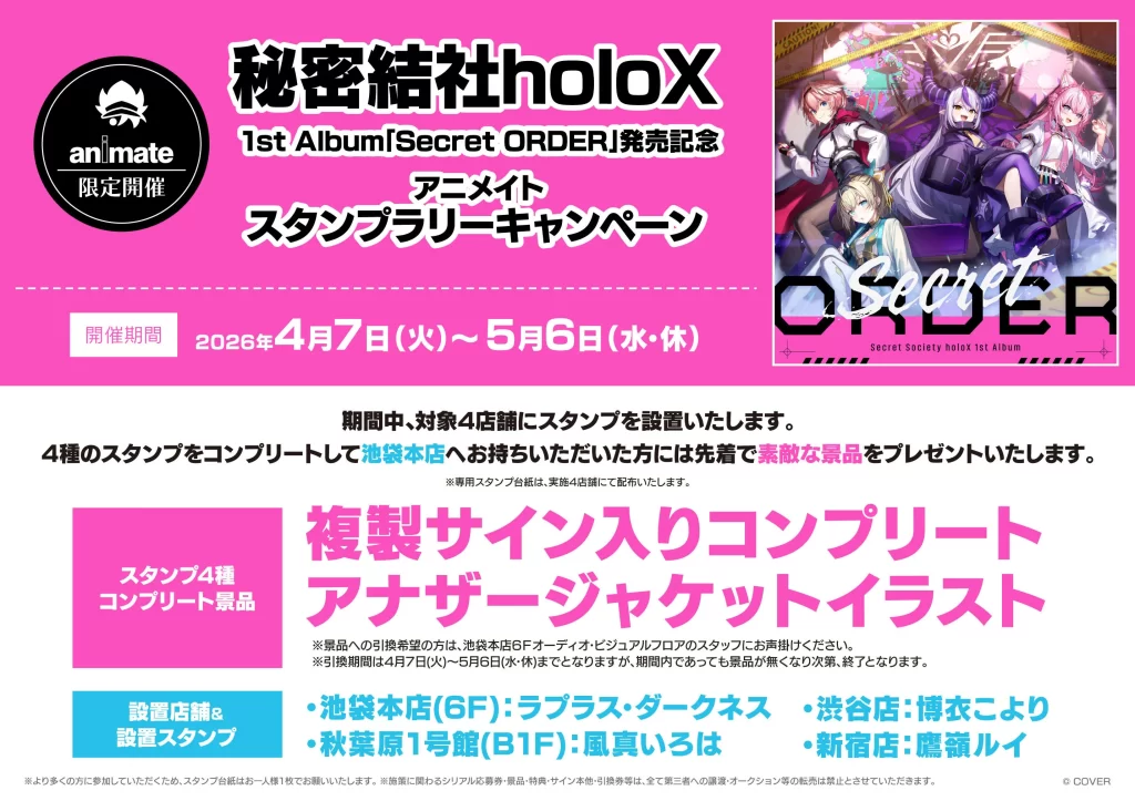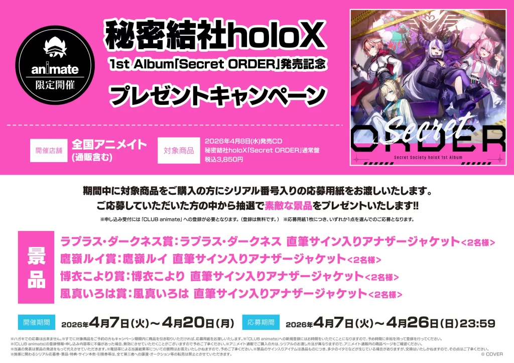 期間中、アニメイトで秘密結社holoX 1st Album『Secret ORDER』をご購入いただいた方の中から抽選で合計8名様に直筆サイン入りアナザージャケットをプレゼント!